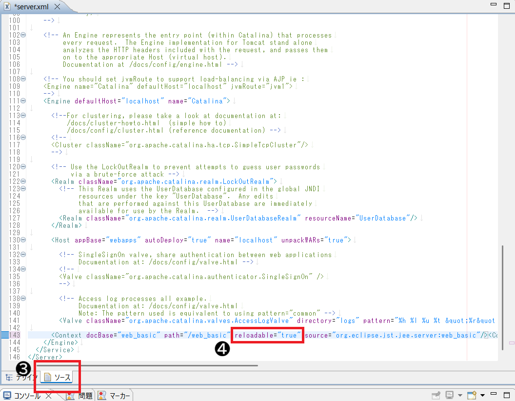 server.xmlが開けたら、ソースタブを選択し編集を行います。