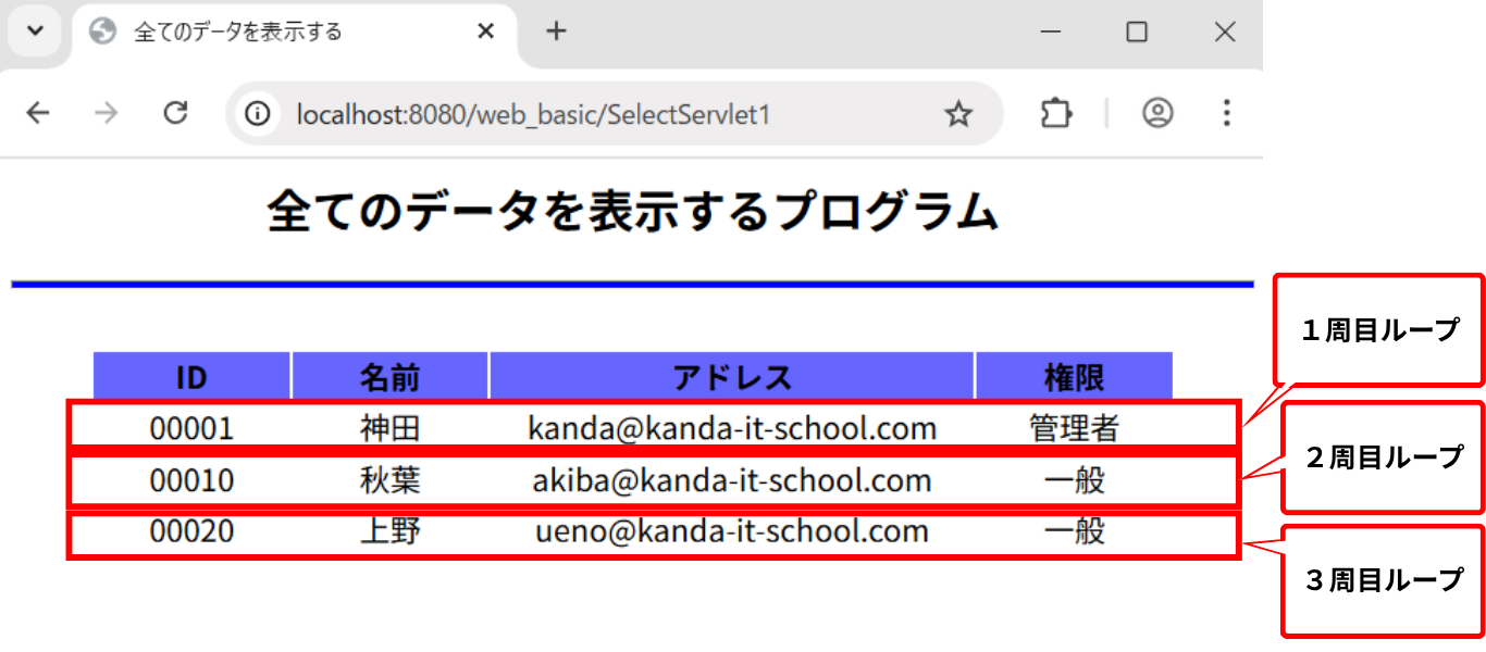 このように、Webアプリケーション上からJDBCを利用して取得したデータを、ループ処理によって一覧として表示することが可能です。