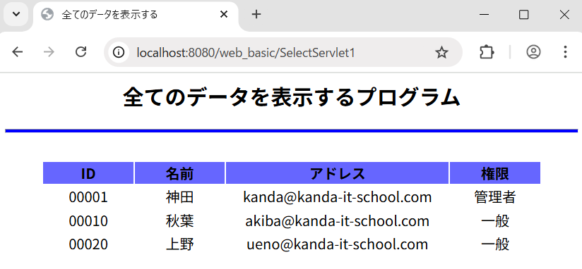 Webアプリケーション上でJDBCを利用して全てのデータを検索し、Webブラウザに一覧として表示します。