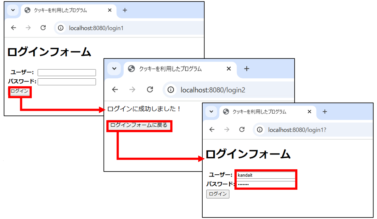 2回目以降のアクセス時、loginメソッドでは、取得したCookie配列からfor文とgetName()メソッドを利用してクッキーの名前を比較し、各値を取得しています。この値を各フォームの初期値とすることで入力済みの状態にすることができます。