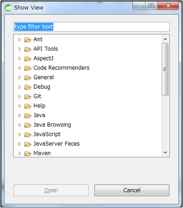 このダイアログでは、Eclipseに用意されているビューが、種類ごとに分類されて一覧表示されます。ここから使いたいビューを選択し、「開く」ボタンをクリックすれば、そのビューを開くことができます。