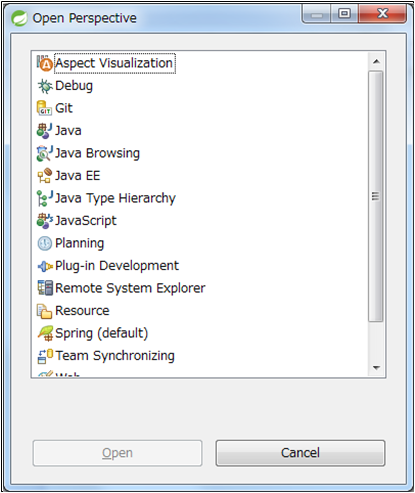 ここから使いたいものを選んでOKすれば、そのパースペクティブを開くことができます。パースペクティブが変わると、<パースペクティブを開く>のサブメニューに表示されるパースペクティブのメニュー項目も変わるため、「あったはずのパースペクティブが見つからない」といったことになりがちです。メニューにないパースペクティブの開き方は今のうちに覚えておきましょう。