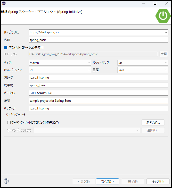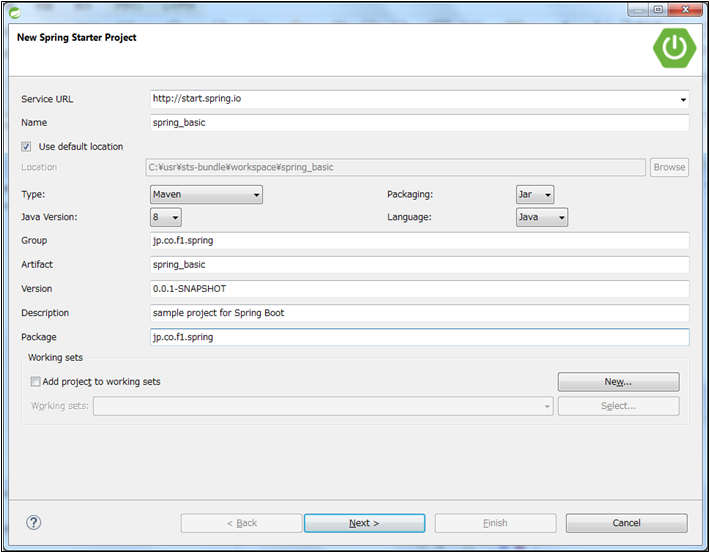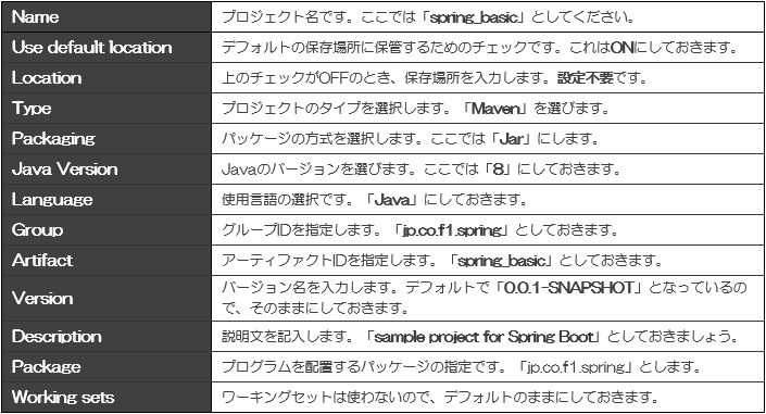 画面に「新規Springスターター・プロジェクト」というダイアログウィンドウが現れます。ここで、作成するプロジェクトの設定を入力していきます。以下を参考に入力してください。