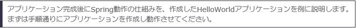 アプリケーション完成後にSpring動作の仕組みを、作成したHelloWorldアプリケーションを例に説明します。まずは手順通りにアプリケーションを作成し動作させてください。