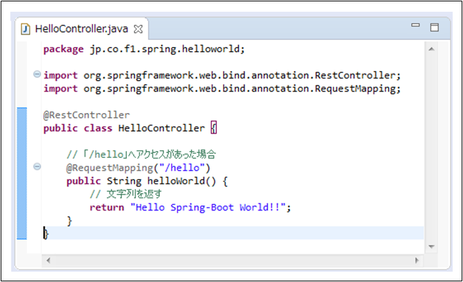 作成した「HelloController」クラスファイルに以下に示すソースコードを記述(追記)する。