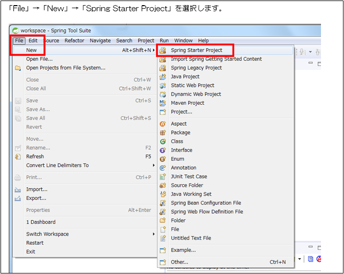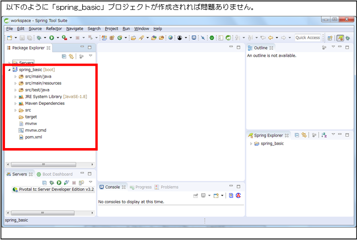 このサンプルプログラムは、Springで「Hello Spring-Boot World!!」という文字列を表示するプログラムです。簡単なアプリケーションを手順通り作成することで、Springを用いたアプリケーションの作成方法を学習していきます。