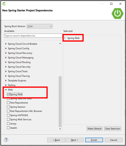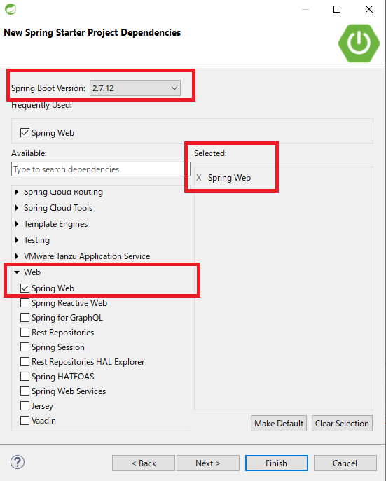次に進むと、ずらっとチェックボックスが並んだ画面が現れます。これは「Dependencies」の設定を行う画面です。このプロジェクトで使用するフレームワークやライブラリなどを選択する画面と考えてください。