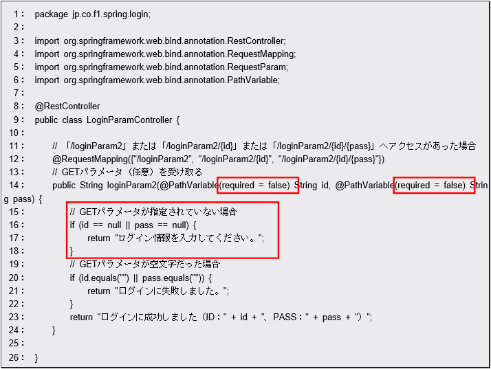 このようになっていますね。この{id} {pass}の部分が、パス変数の指定です。これは、”/loginParam2/”というアドレスの後にあるパスの値をid , passという変数として受け取ることを示します。