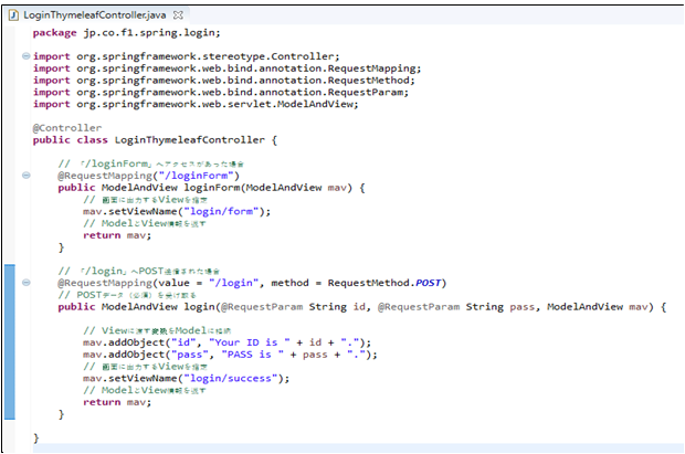 作成した「LoginThymeleafController」クラスファイルに以下に示すソースコードを記述する。