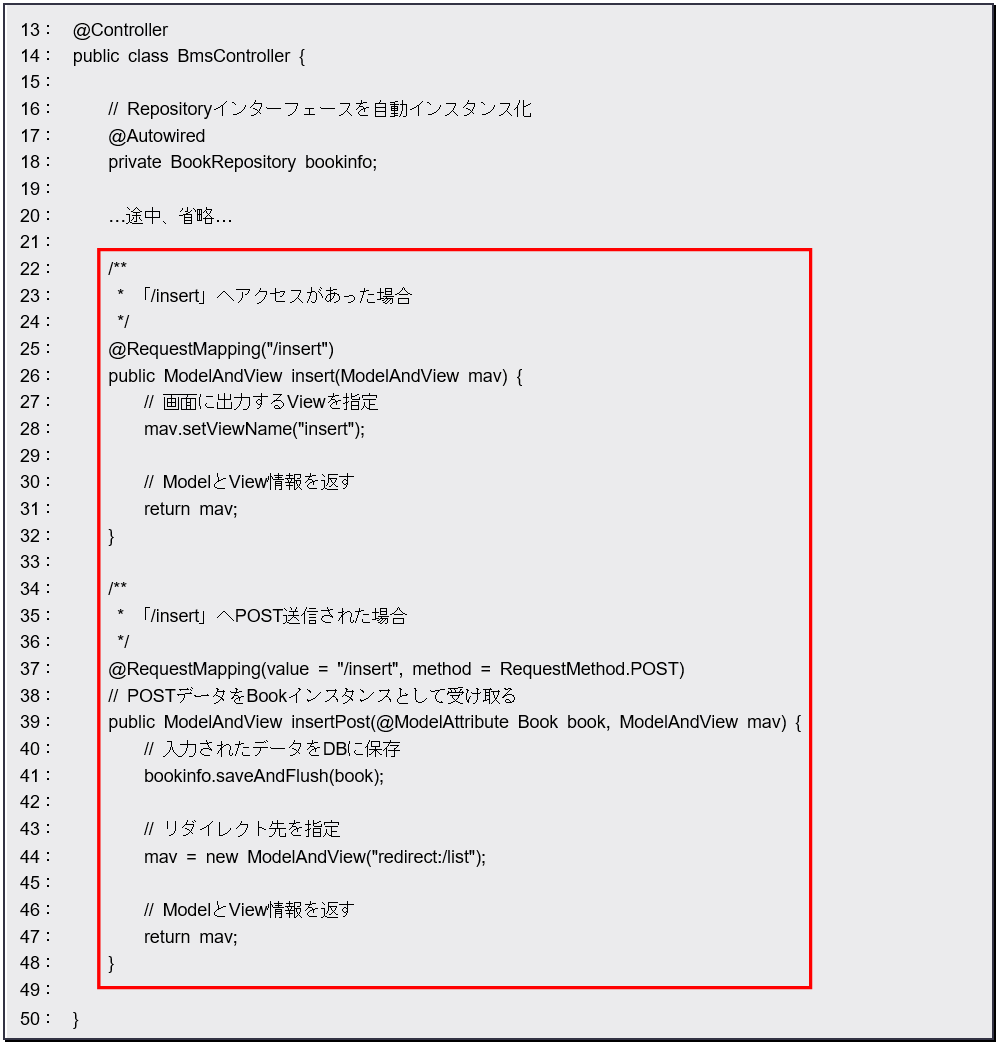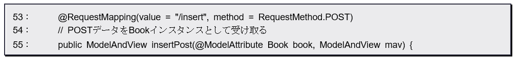 insertPostメソッドにはBookインスタンスが引数として指定されていますが、これには「@ModelAttribute」というアノテーションが付けられています。これはエンティティクラスのインスタンスを自動的に用意するのに用いられます。引数には、インスタンスの名前を指定します。