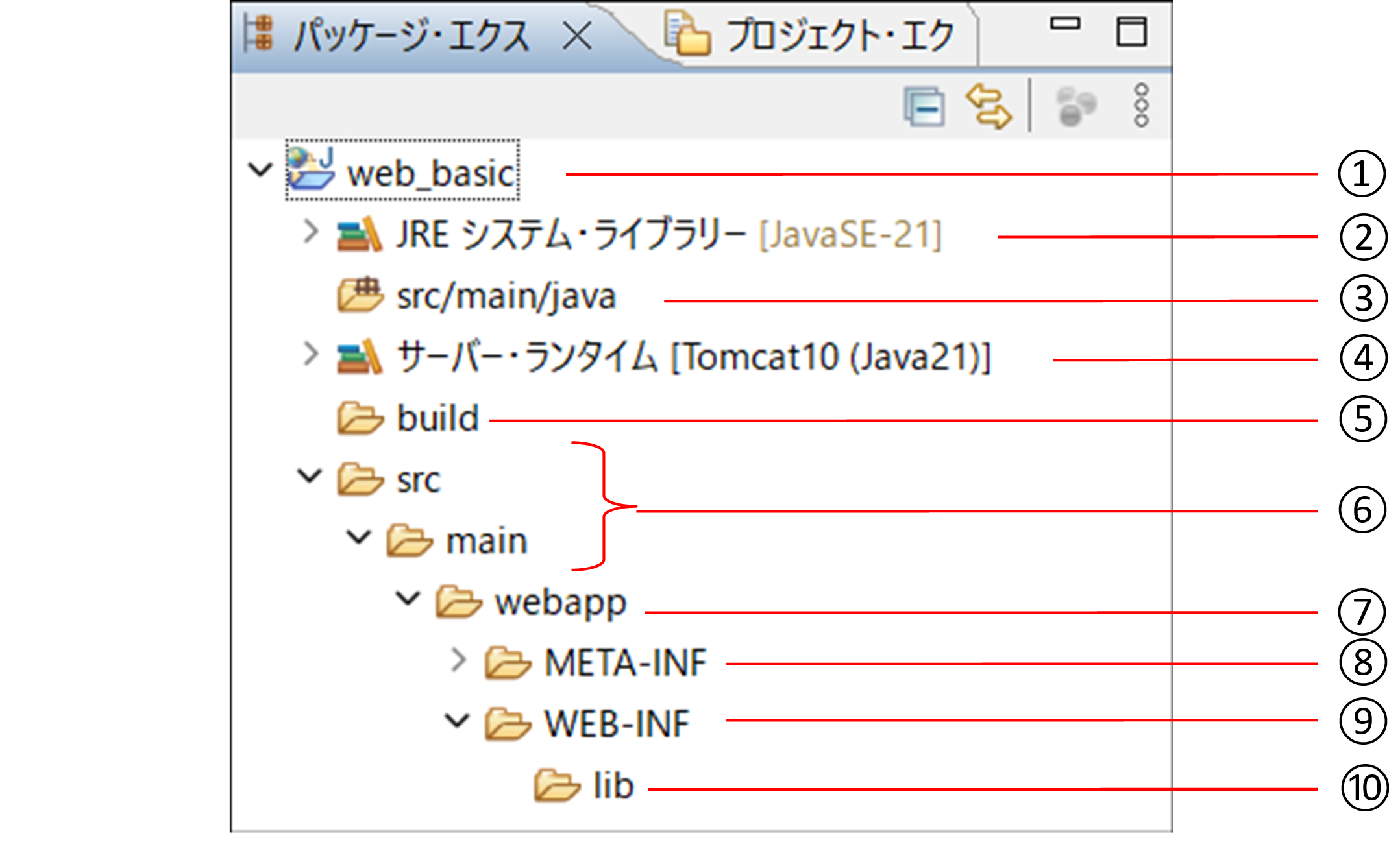 ① 「ソース・フォルダー」とは、ソースコードを入れておくフォルダのことを指します。ここでは、プロジェクトフォルダの中のsrcフォルダに格納します。これは既に入力がされている項目です。