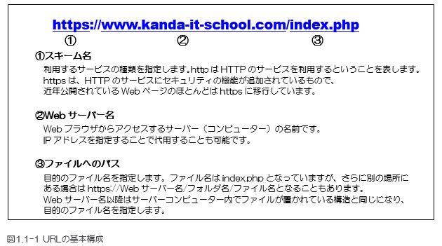 上記の例では、神田ITスクールのWebサイトが、インターネット上のどこにあるかを表しています。WebブラウザからURLを指定することで、「どこそこのコンピューターにある、なになにのファイル」というように、目的のWebページの情報を特定することができます。 一般的なURLは図1.1-1のような構造をしています。