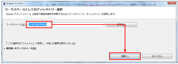 Eclipseを実行すると、「ワークスペースの選択」画面が表示されます。画面のワークスペースの項目に「../xampp/htdocs」というパスが設定されているかどうかを確認します。それ以外のパスが設定してある場合は、「参照」をクリックし、「C:\usr\kis_php_pkg_2023\xampp\htdocs」を選択して「起動」ボタンをクリックします。