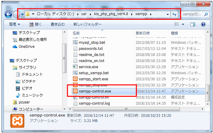XAMPPコントローラを起動させるには、以下画面の実行ファイル「xampp-control.exe」をダブルクリックします。「C:\usr\kis_php_pkg_2023\xampp」は、当スクール指定のインストール先です。
