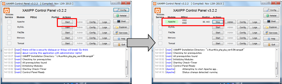 Apach(Webサーバ)を起動させるには、以下XAMPPコントローラ画面上のApache右側の「Start」ボタンを押下します。下の右側の図のようにApaheの背景色が緑色になれば成功です。