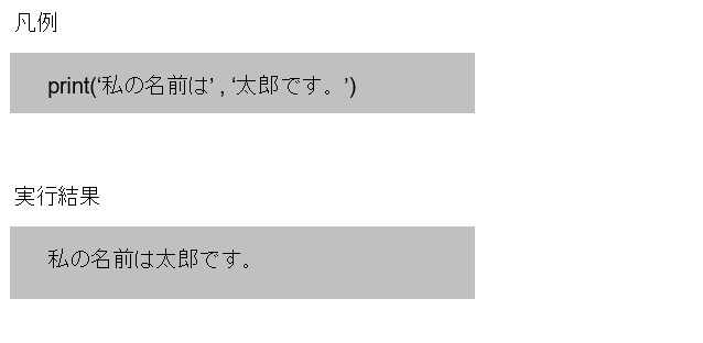 print(‘私の名前は’, ‘太郎です。’)