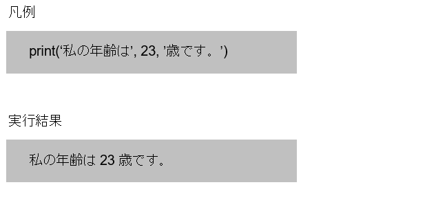 print(‘私の年齢は’, 23, ‘歳です。’)
