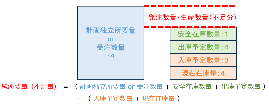 これらを用いて、所要量は「計画独立所要量(予測で必要な数量)or 受注数量」と 「現在庫数量・入庫予定数量・出庫予定数量・安全在庫数量」を比較して、必要な生産・購買数量を算出します。